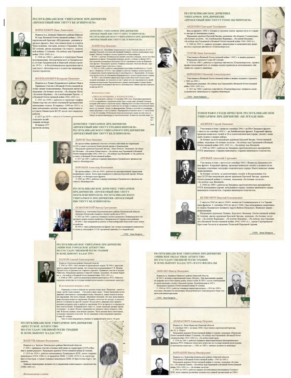 Накануне 9 Мая имена 227 ветеранов – землеустроителей, геодезистов, картографов, воевавших с врагом на фронтах Великой Отечественной войны, сражавшихся в партизанских отрядах, а также тех, кто помогал ковать победу над фашизмом в тылу, в разные годы трудившихся в системе Госкомимущества, а также краткая обобщенная информация о них была опубликована на страницах ведомственного научно-практического журнала «Земля Беларуси».