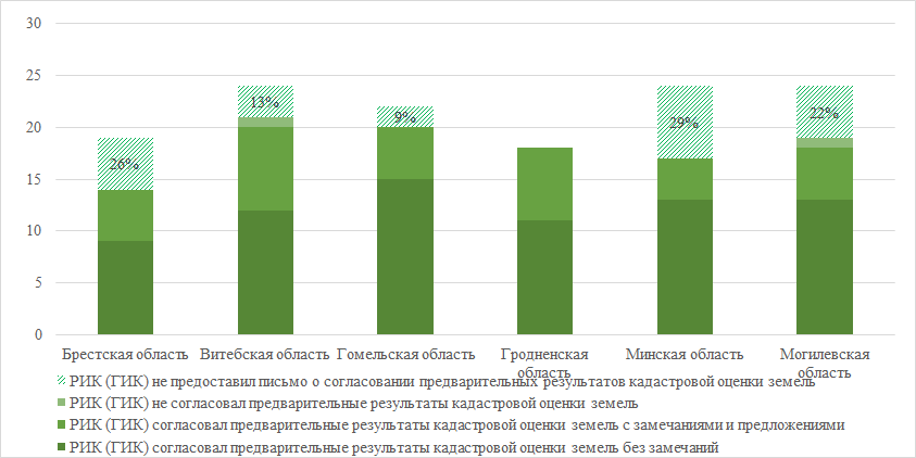 По данным на 6 марта 2017 года от 107 из 129 исполнительных комитетов получены письма о согласовании предварительных результатов кадастровой оценки земель по видам функционального использования земель «жилая усадебная зона (включая садоводческие товарищества и дачные кооперативы)» и «рекреационная зона». В 32 % случаев исполнительные комитеты имеют замечания и предложения к результатам. Два исполнительных комитета предварительные результаты данной кадастровой оценки не согласовали (Кричевский РИК и Витебский ГИК).