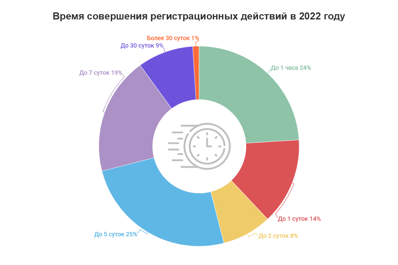 Стоит добавить, что в 2022 году время совершения 24% регистрационных действий не превысило 1 часа. По сравнению с 2021 годом этот показатель вырос на 2%.