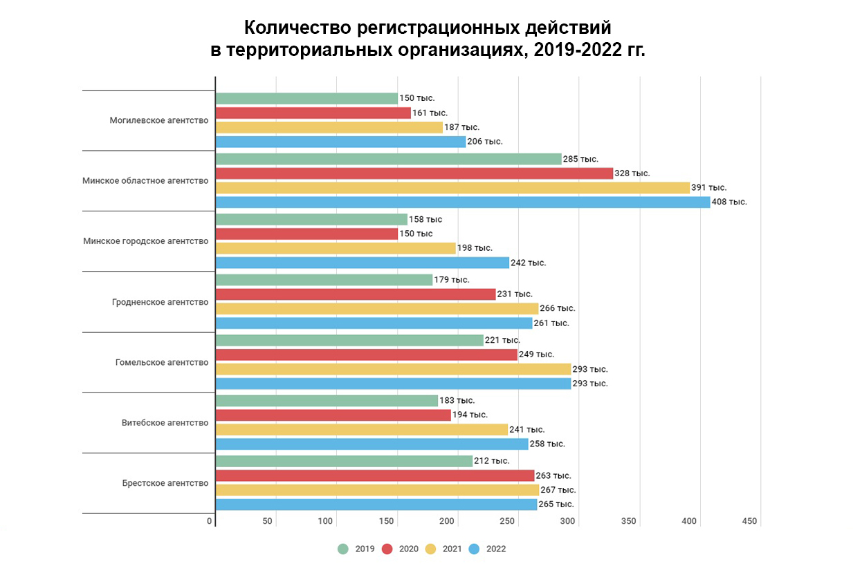 Анализируя динамику регистрационных действий в разрезе регистрационных округов, можно отметить, что по сравнению с 2021 годом наибольший рост зафиксирован в Минском городском агентстве (+22%). Годом ранее организация также показала самый большой прирост среди регистрационных округов.