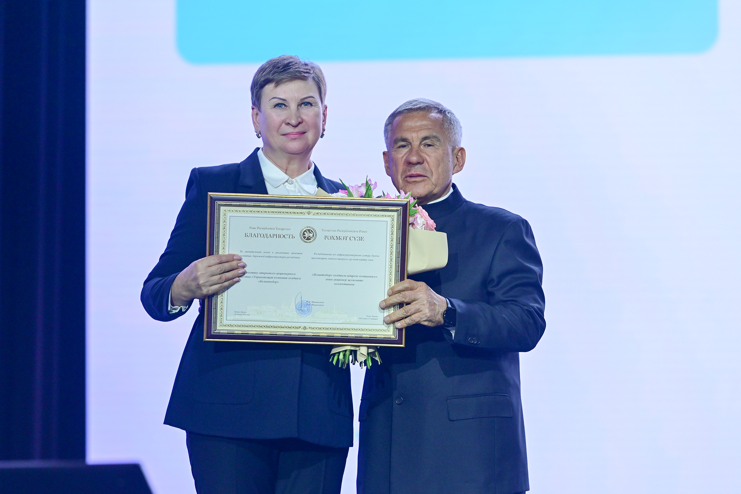 Коллектив холдинга «Белавтодор» удостоен Благодарности Раиса Республики Татарстан за значительный вклад в реализацию проектов по развитию дорожной инфраструктуры республики. Заместителю генерального директора по экономике Елене Пунчик награду вручил Рустам Минниханов в ходе итоговой коллегии Министерства транспорта и дорожного хозяйства Республики Татарстан.