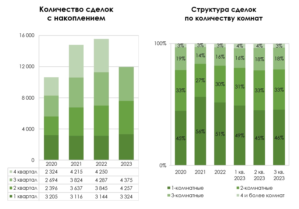 реестра цен, суммарно в третьем квартале 2023 года совершено 4 375 сделок купли-продажи, что на 3% и 32% больше, чем во втором и первом квартале 2023 года соответственно. Самым результативным месяцем по количеству сделок за три квартала стал август: зарегистрировано 1 637 сделок.