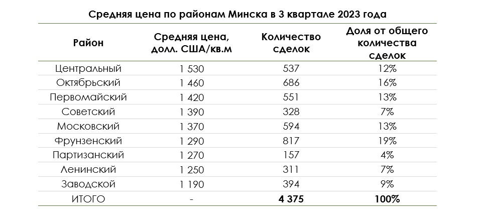 По территориальному признаку лидером в общем количестве сделок стал самый большой район Минска – Фрунзенский. Здесь в течение третьего квартала было совершено 817 сделок. Самый дорогой район Минска – Центральный, где квартиру можно приобрести в среднем за 1 530 долларов США за квадратный метр.