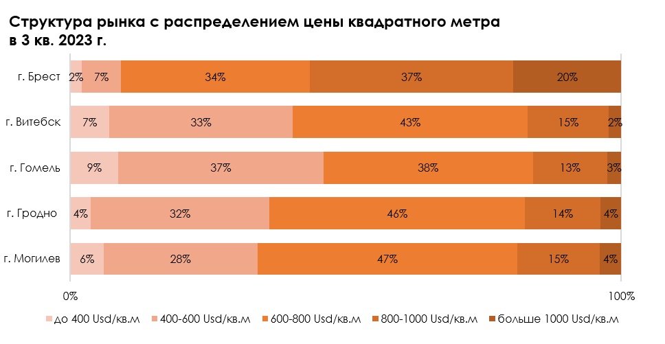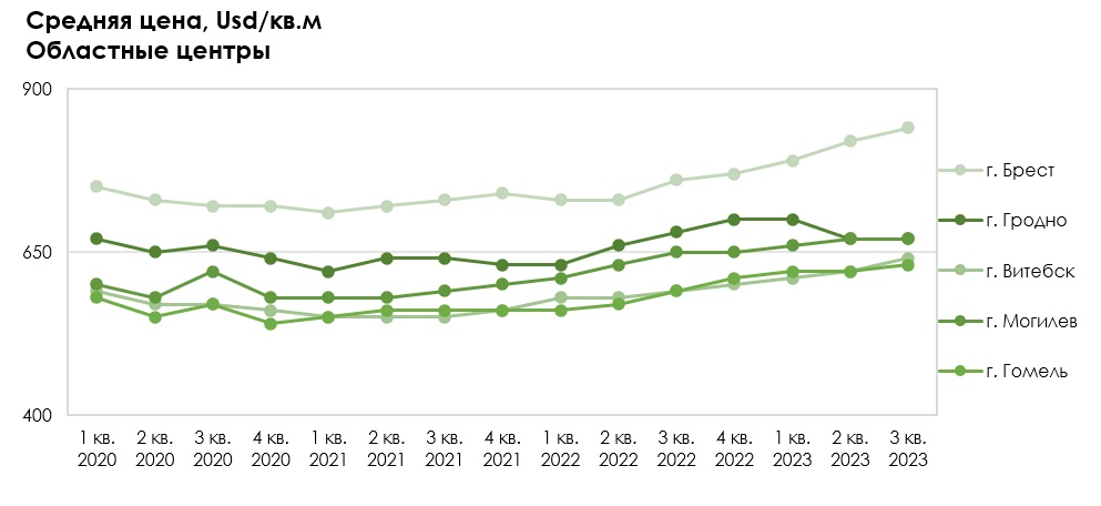 В областных городах средняя цена квадратного метра в долларовом выражении по итогам третьего квартала 2023 года по отношению ко второму кварталу увеличилась в Бресте, Гомеле и Могилеве на 2%, в Витебске – на 3%, в Гродно – не изменилась.