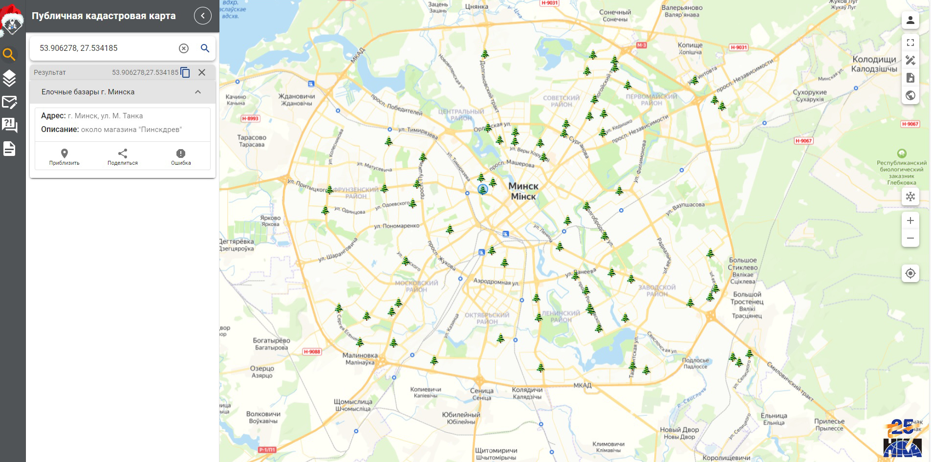 публичной кадастровой карте слой «Елочные базары Минска». Он включает почти 70 торговых площадок столицы, на которых можно приобрести традиционную ель, сосну, деревья в кадках, а также новогодние букеты.
