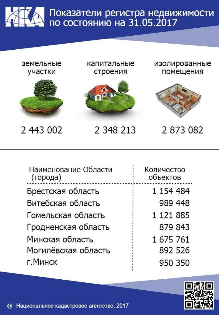 Всего по состоянию на 31 мая 2017 года в едином государственном регистре недвижимого имущества, прав на него и сделок с ним было зарегистрировано 7 664 797 объектов. По сравнению с 31 декабря 2016 года количество зарегистрированных объектов увеличилось на 99 582 объекта (1,3% прироста).