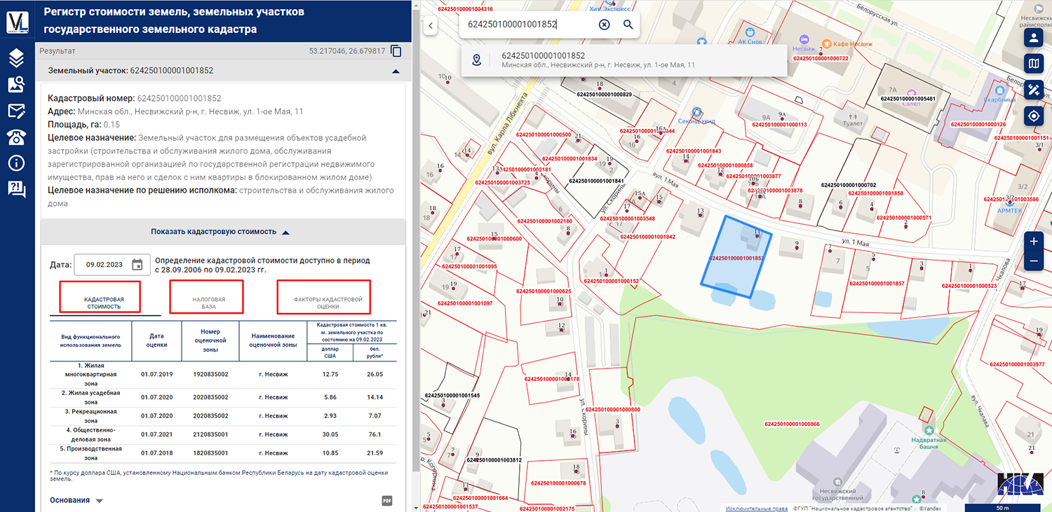 Информация о кадастровой стоимости и налоговой базе земельного налога теперь размещена в единой карточке объекта. Также добавлена возможность просмотра перечня факторов оценки в отношении различных территорий, видов функционального использования земель и дат оценки, использованных при проведении кадастровой оценки, на основании материалов по кадастровой оценке земель, земельных участков, а также определения кадастровой стоимости c помощью соответствующего калькулятора на главной странице ресурса.