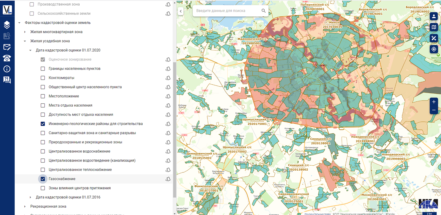 Помимо актуального оценочного зонирования, границ земельных участков и адресных точек на информационном ресурсе регистра стоимости размещена информация о результатах кадастровой оценки земель, земельных участков начиная с 2015 года. Также доступна информация о покрытии факторами оценки в отношении различных территорий, видов функционального использования земель и дат оценки, использованных при проведении кадастровой оценки, на основании материалов по кадастровой оценке земель, земельных участков.
