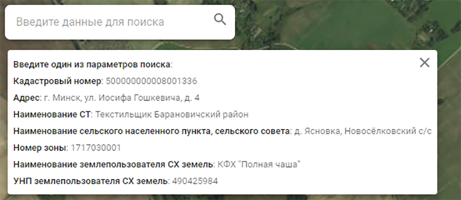 Поисковая строка обновленного ресурса позволяет ввести семь вариантов поискового запроса: от кадастрового номера до наименования сельскохозяйственной организации.