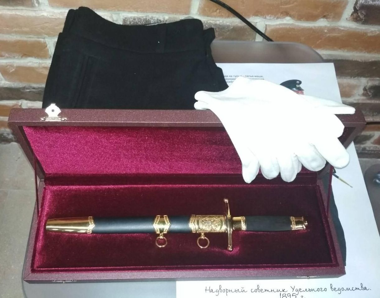 Каждая деталь форменной одежды представителя государственной власти (форменный головной убор с козырьком и кокардой, кортик) имела значение. На фуражке и мундире цвет, шитье, пуговицы и кокарды строго регламентировались по ведомствам. При изготовлении музейного образца были использованы аналогичные материалы, которые применялись в 19 веке: натуральная шерсть, конский волос в подкладке для сохранения формы мундира при дождливой погоде, подкладка из натуральной ткани, плечевые знаки, 3 звездочки. Кортик, который чиновники носили при себе, использовался в качестве подвеси, а не как боевое оружие.