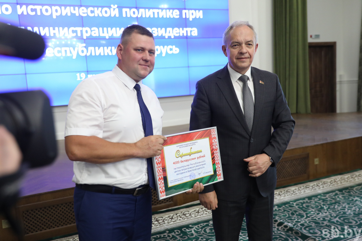В мае на заседании Республиканского совета по исторической политике при Администрации Президента была объявлена общенациональная акция по сбору средств на строительство центра. Напомним, что на эти цели была направлена половина денег, заработанных на республиканском субботнике, – это около семи миллионов рублей. Более 550 тысяч рублей пожертвовали государственные и коммерческие организации страны, более 20 тысяч рублей поступило на специальный счет от граждан. Четыре тысячи рублей собрали сотрудники Администрации Президента – Глава Администрации Игорь Сергеенко передал директору Брестского областного центра молодежного творчества Виктору Иванову сертификат.