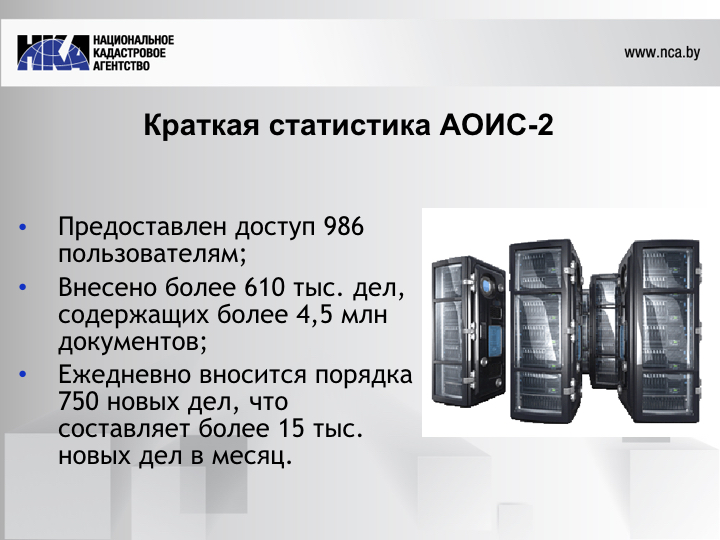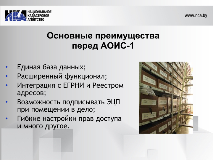 В настоящее время Национальное кадастровое агентство Госкомимущества продолжает совершенствовать Архивную открытую информационную систему (АОИС). Вторая версия АОИС – комплексная система электронного архива, предназначенного для хранения в электронном виде регистрационных дел, за год с начала ее внедрения позволила только в одной Минской области сконвертировать более 117 000 регистрационных дел.