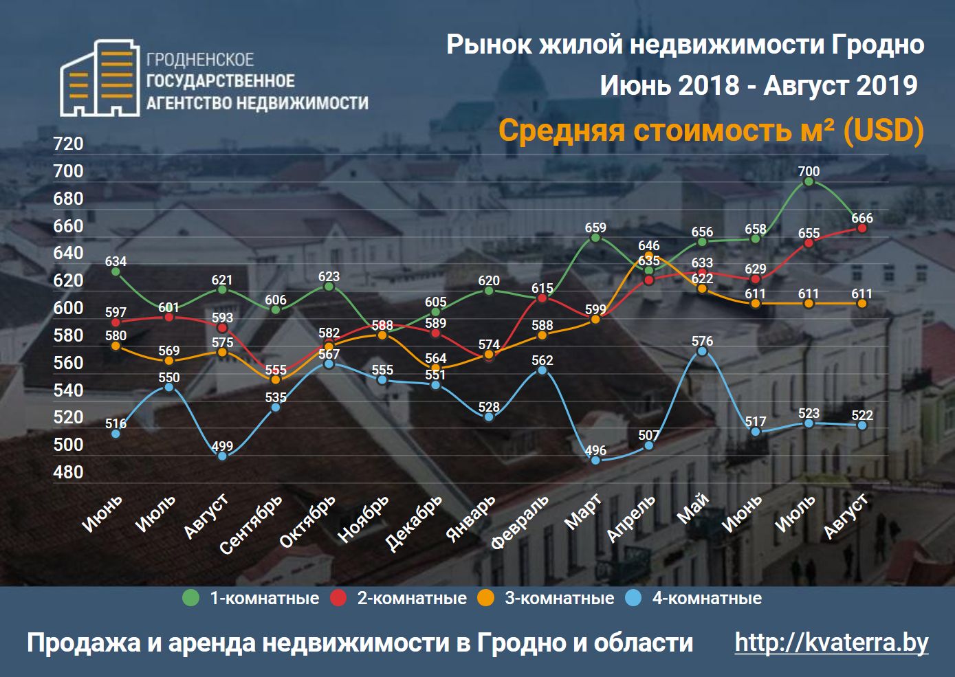 Рынок четырёхкомнатных квартир характеризуется минимальным количеством сделок, сообщили в Гродненском агентстве по госрегистрациии земельному кадастру. Средние цены за м2 колебались в течение летних месяцев вокруг отметки в 520 долларов.