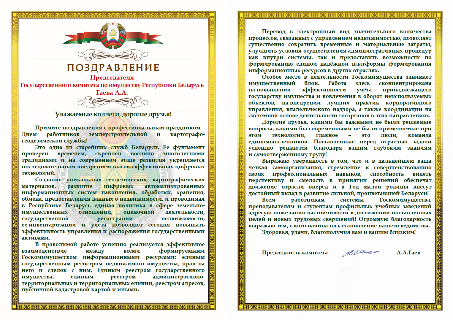 Поздравление Председателя Госкомимущества А.А.Гаева с профессиональным праздником – Днем работников землеустроительной и картографо-геодезической службы