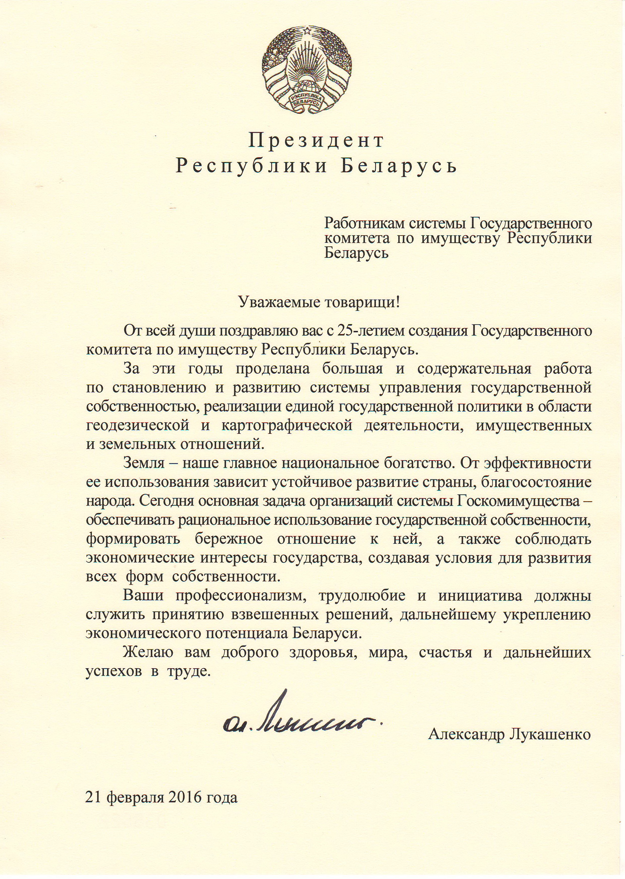 Поздравление Президента Республики Беларусь с 25-летием создания Государственного комитета по имуществу Республики Беларусь