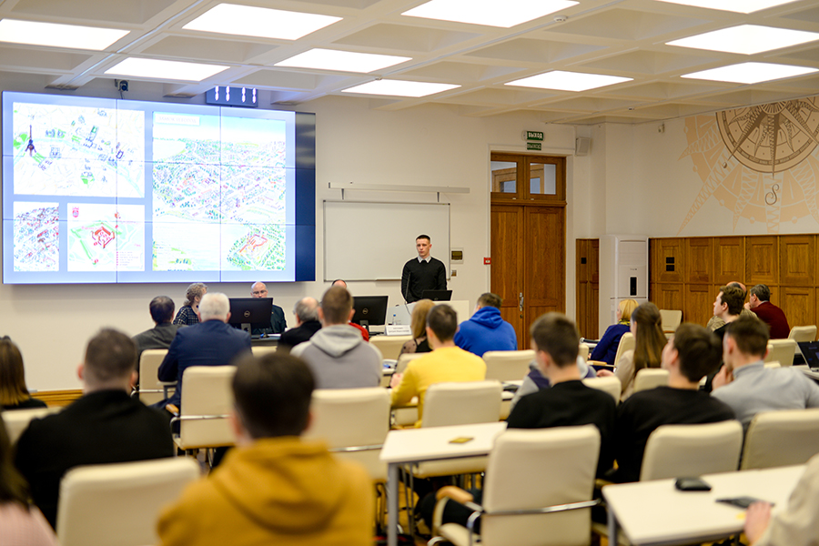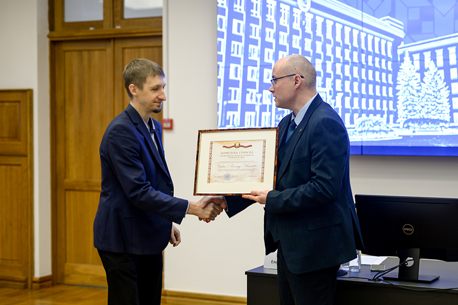 В рамках мероприятия Дмитрий Матусевич также вручил преподавателям университета награды Госкомимущества, приуроченные к профессиональному празднику. Продолжилась работа диалоговой площадки выступлениями с научными докладами студентов и магистрантов факультета. Молодые ученые затронули темы применения методов пространственной эконометрики для оценки недвижимого имущества и BIM-технологий в градостроительной деятельности, 3-D моделирования объектов историко-культурного наследия Беларуси для электронных систем, картографического отображения современных демографических процессов и другие.