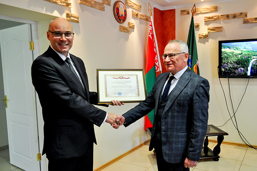 В завершение рабочего визита в Гродно Дмитрий Матусевич наградил Почетной грамотой Государственного комитета по имуществу Петра Волкова – директора УП «Проектный институт Гродногипрозем». Руководитель предприятия был удостоен данной награды за активное содействие Госкомимуществу в реализации функций государственного регулирования в области земельных отношений, охраны и рационального использования земель, а также добросовестный и плодотворный труд и достижение высоких производственных показателей.