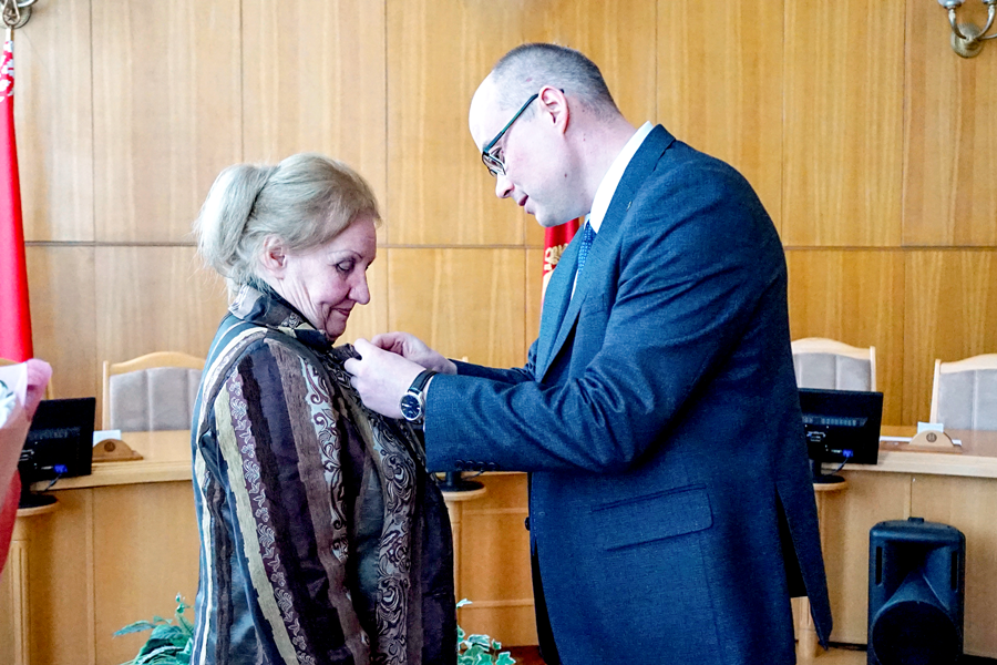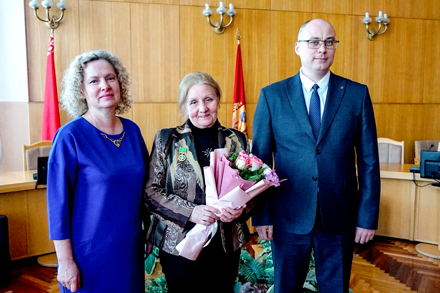 В завершение рабочей поездки Председатель Госкомимущества посетил Могилевское агентство по государственной регистрации и земельному кадастру, где вручил нагрудный знак отличия Государственного комитета по имуществу Республики Беларусь «За добрасумленную працу ў сістэме дзяржмаёмасці» Жанне Пономаренко – бывшему главному специалисту землеустроительной и геодезической службы г.Могилева.