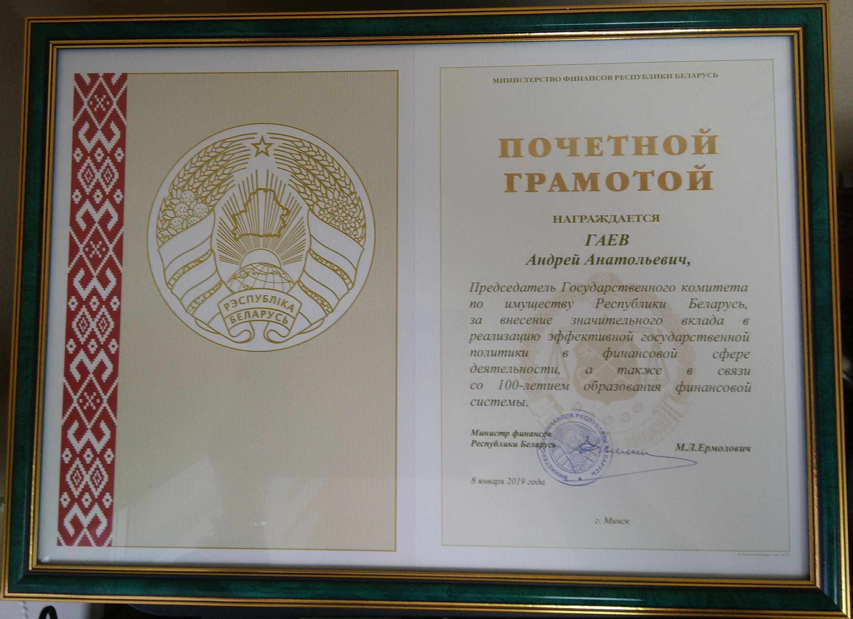 Председатель Государственного комитета по имуществу Республики Беларусь Андрей Гаев награжден Почетной грамотой Министерства финансов Республики Беларусь