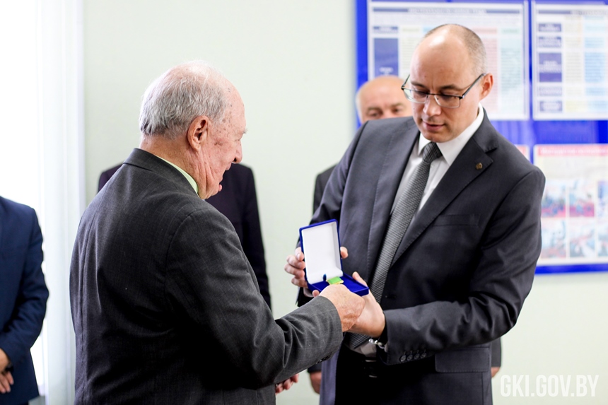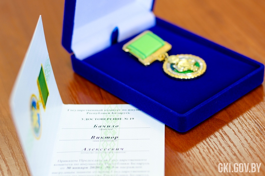 Помимо этого, Дмитрий Матусевич вручил нагрудный знак отличия Государственного комитета по имуществу Республики Беларусь «За добрасумленную працу ў сiстэме дзяржмаёмасцi» Виктору Бачило, который ранее занимал должность главного инженера Брестского филиала института «Белгипрозем».
