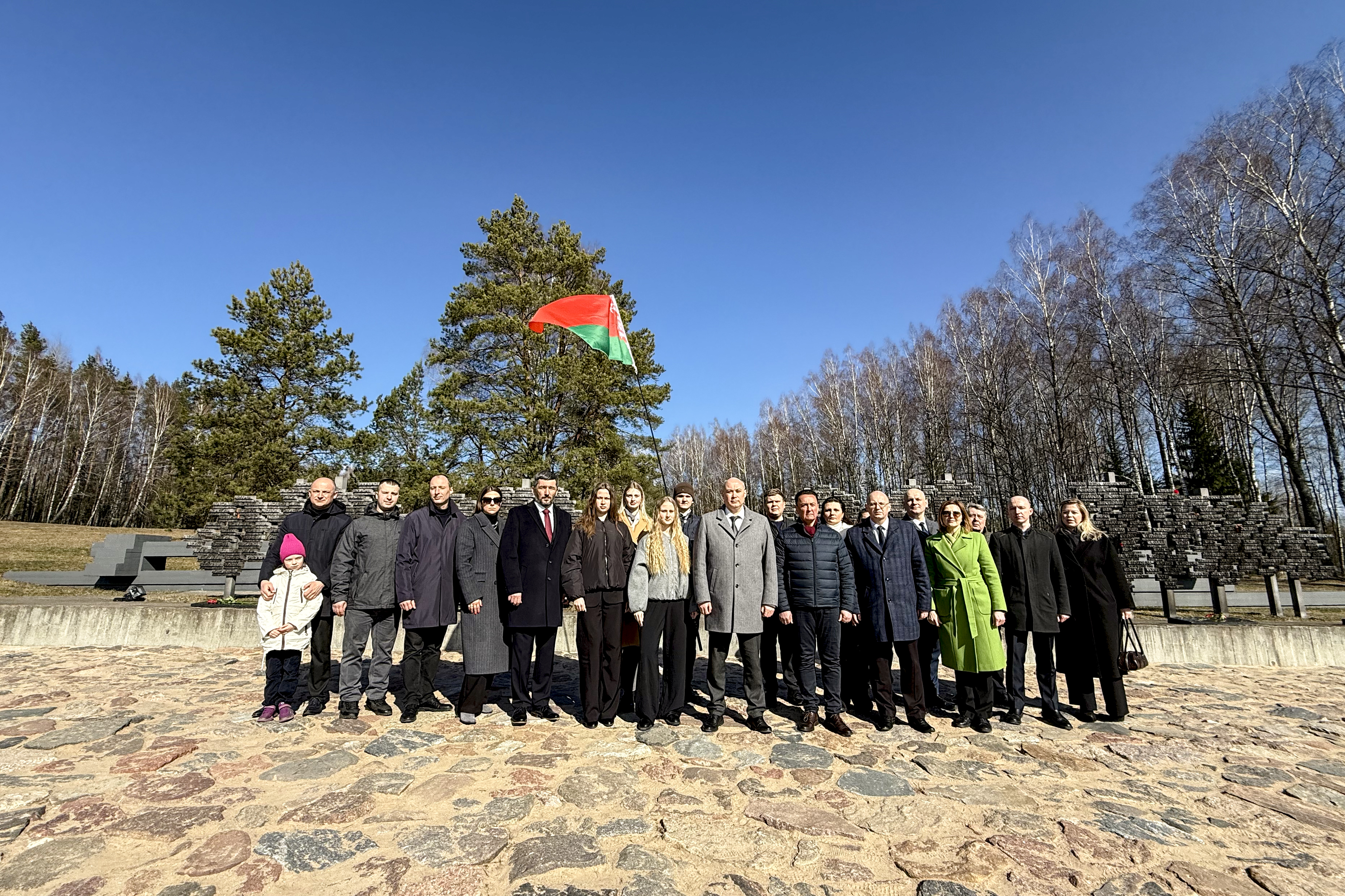 Делегация Государственного комитета по имуществу во главе с Председателем Дмитрием Матусевичем приняла участие в возложении цветов у Вечного огня в мемориальном комплексе «Хатынь» по случаю 82-ой годовщины трагедии.