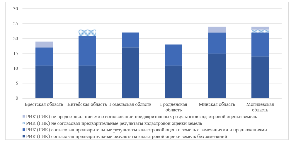 Три исполнительных комитета (Чашникский РИК, Кричевский РИК и Витебский ГИК) предварительные результаты кадастровой оценки земель по видам функционального использования земель «жилая усадебная зона» (включая садоводческие товарищества и дачные кооперативы) и «рекреационная зона» не согласовали. Причиной отказа Чашникский и Кричевский райисполкомы указали снижение кадастровой стоимости по отношению к прошлой оценке. Что касается Витебского горисполкома, то здесь посчитали целесообразным согласовать результаты кадастровой оценки земель после марта 2017 года, так как гп Руба Витебского района включат в границу г. Витебск и такая административно-территориальная единица перестанет существовать.