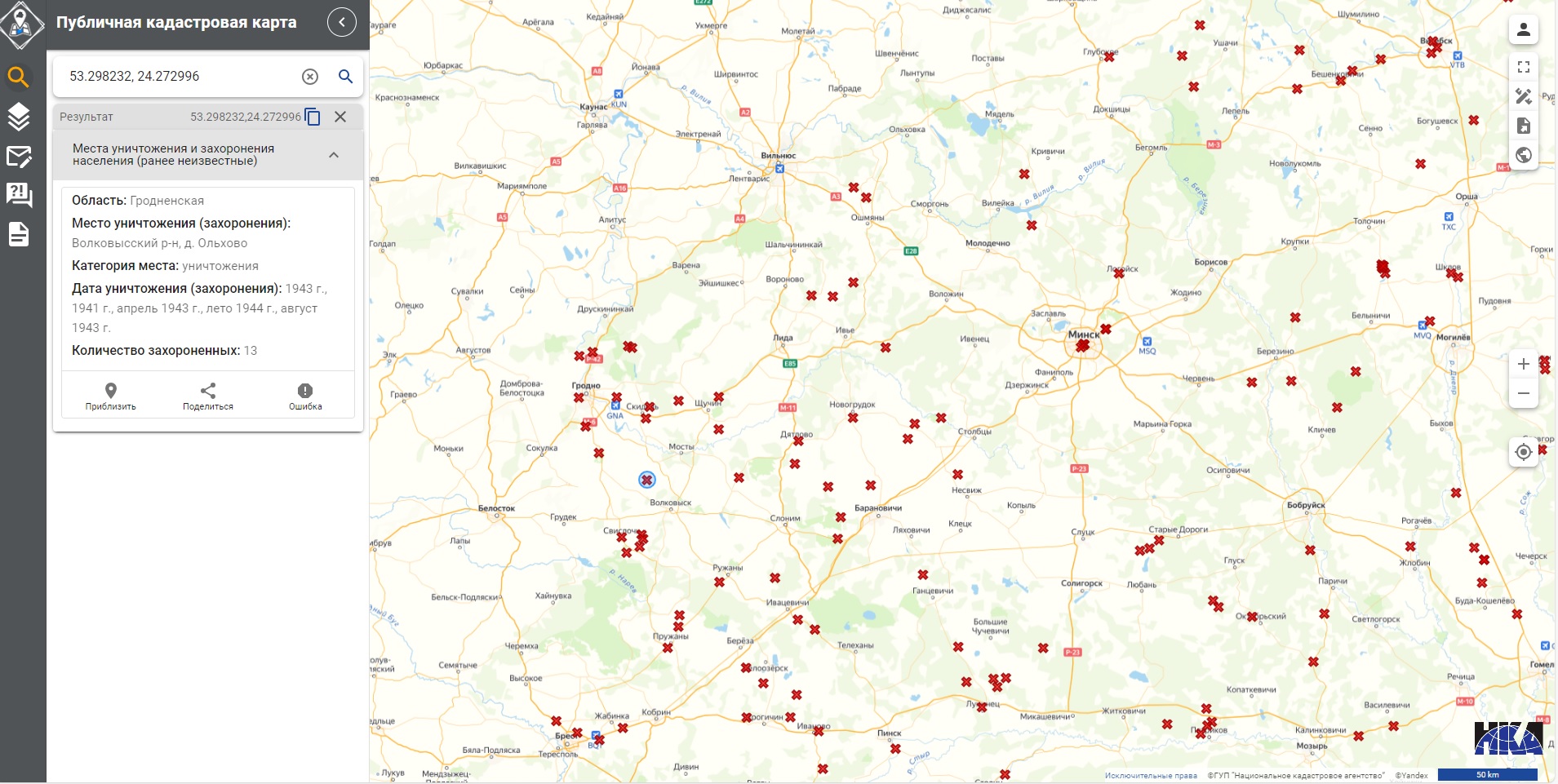 публичной кадастровой карте. Информация была получена по результатам расследования Генеральной прокуратурой уголовного дела о геноциде населения Беларуси в годы Великой Отечественной войны и послевоенный период. На сегодняшний день на карте отражено 144 из выявленных 163 таких мест.