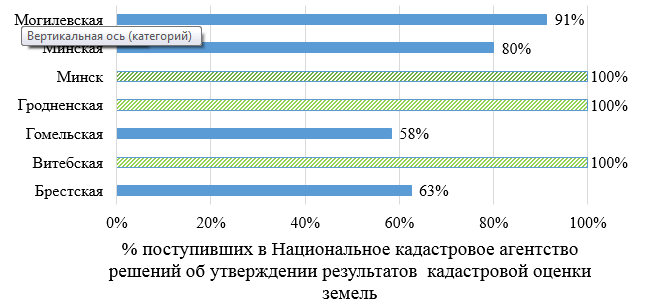 По состоянию на 30 июля 2018 года для внесения результатов кадастровой оценки земель в регистр стоимости в адрес Национального кадастрового агентства поступило 79% решений об утверждении результатов кадастровой оценки земель, в регистр стоимости внесены результаты кадастровой оценки земель по 74% территорий Республики Беларусь.