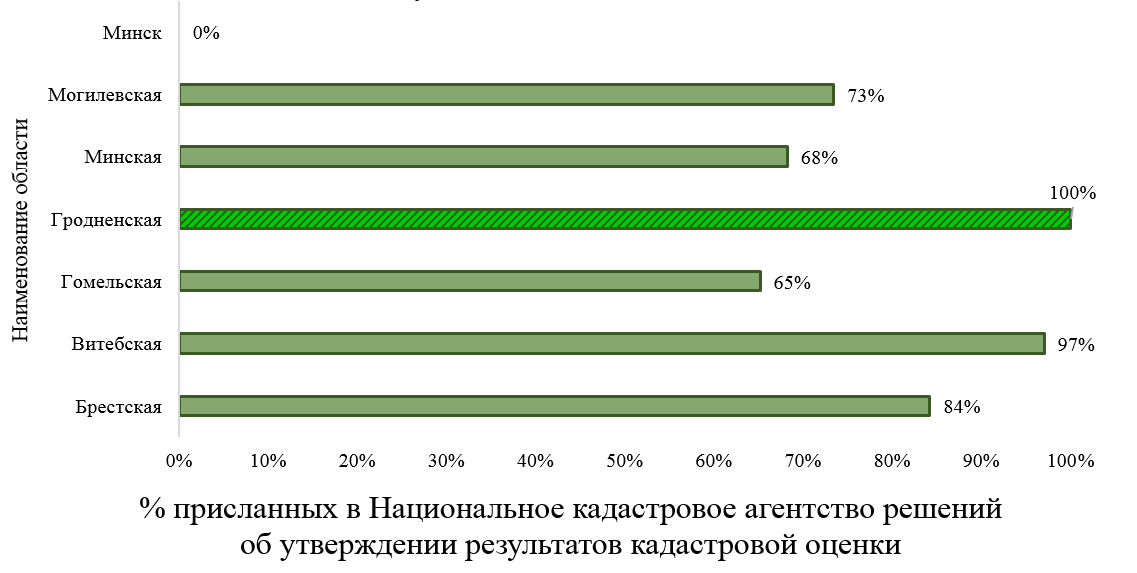 В Национальном кадастровом агентстве отдельно отмечают слаженную работу местных исполнительных комитетов Гродненской области, благодаря которой на сегодняшний день 100 % решений вернулись в Национальное кадастровое агентство. Далее следуют Витебская и Брестская области, количество возвратившихся решений по которым составило 97% и 84% соответственно. По остальным областям данные следующие:
