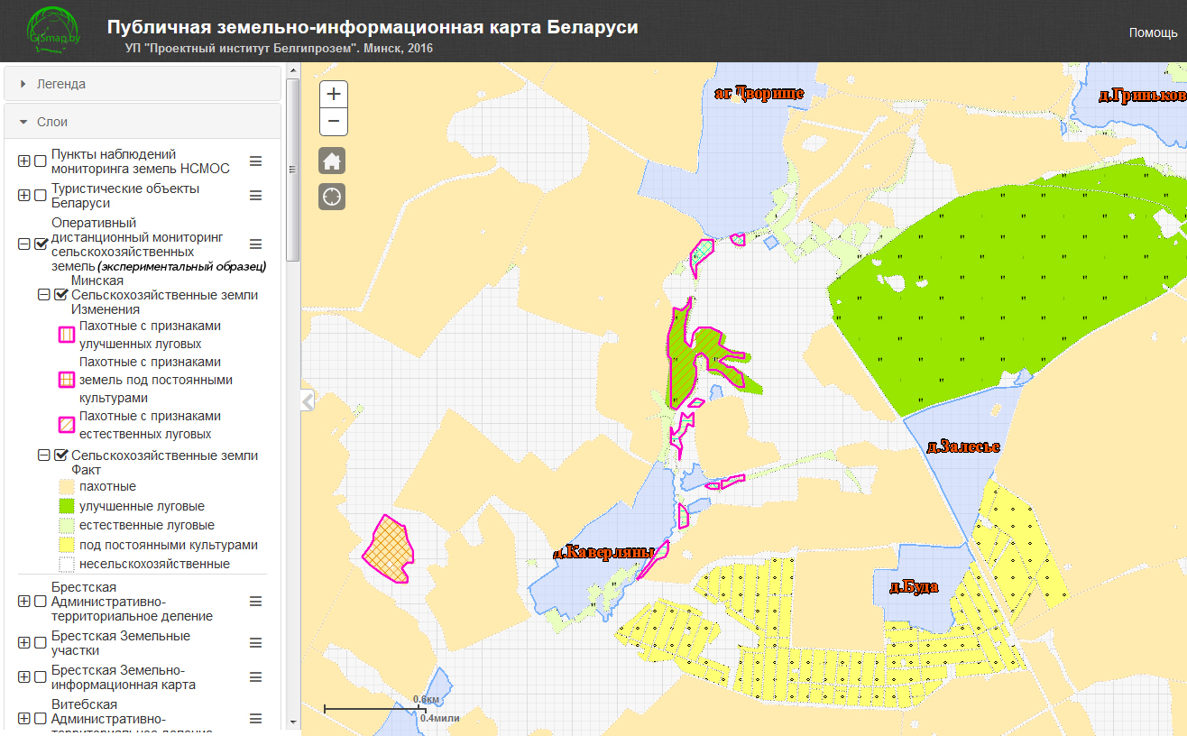 Экспериментальный образец веб-сервиса предназначен для обеспечения доступа к результатам, которые могут быть получены при ведении мониторинга сельскохозяйственных земель, т.е., цифровым картам фактического состояния сельскохозяйственных земель и цифровым картам изменений, выявленных за определенный период наблюдений.