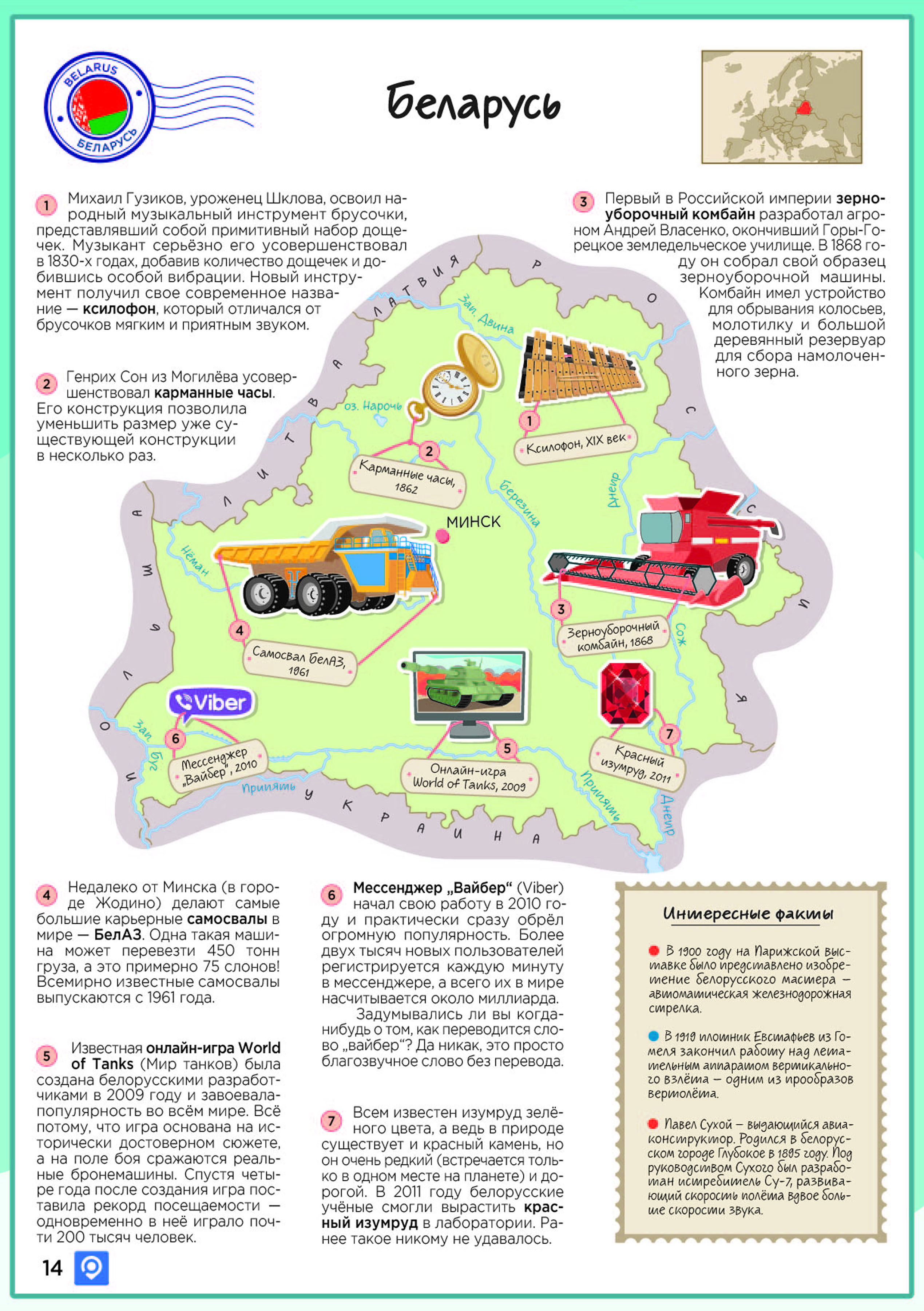 Также в атласе на странице, посвященной изобретениям, рожденным на белорусской земле или ее выходцами, упоминаются: первый в мире зерноуборочный комбайн (1868 г.), разработанный выпускником Горы-Горецкого земледельческого училища Андреем Власенко; гордость белорусского автопрома – самосвал «БелАЗ» (1961 г.), который можно «оживить» с помощью функции дополненной реальности; завоевавшие во всем мире популярность у пользователей компьютерная онлайн-игра «World of Tanks» (2009 г.) и мессенджер «Вайбер» (2010 г.); искусственно выращенный белорусскими учеными «Красный изумруд» (2011 г.).