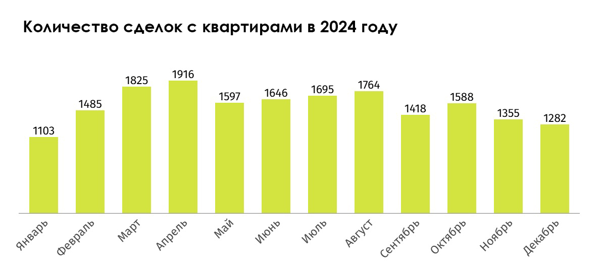 Самым активным месяцем года стал апрель – совершено 1 916 сделок, а самыми малоактивными январь (1 103 сделки) и декабрь (1 282 сделки).