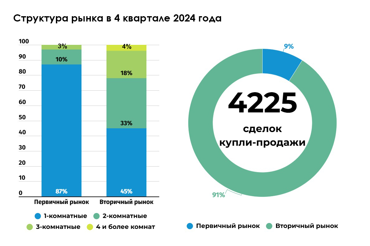 Последний квартал 2024 года принес рынку 4 225 сделок, что меньше, чем в других кварталах года. Начиная с октября количество сделок стало постепенно снижаться. Одной из главных причин эксперты называют некоторые корректировки ставок по кредитам.