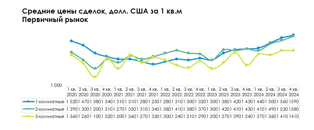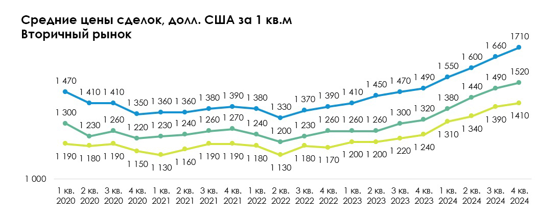 В 2024 году покупатели квартир потратили 1,4 млрд долларов США в экв. на приобретение столичных квадратных метров – это на 17% больше, чем в 2023 году и на 38% больше, чем в 2022 году. Это вызвано как ростом объема приобретенных квадратных метров – на 7% и 21% соответственно, так и ростом цен.