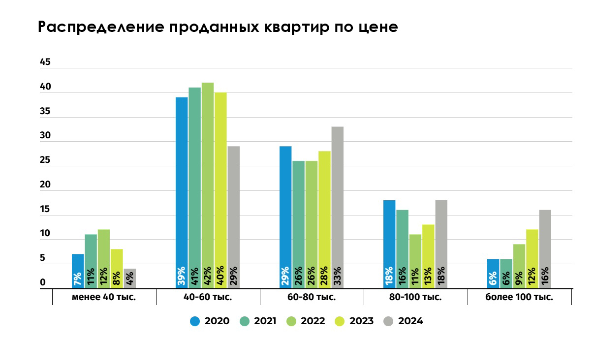 В 2024 году каждая шестая квартира обошлась покупателю в сумму, превышающую 100 тысяч долларов США в эквиваленте. По сравнению с 2023 годом доля дорогих квартир (от 100 тысяч долларов США в экв.) увеличилась на 4 % – до 16%.
