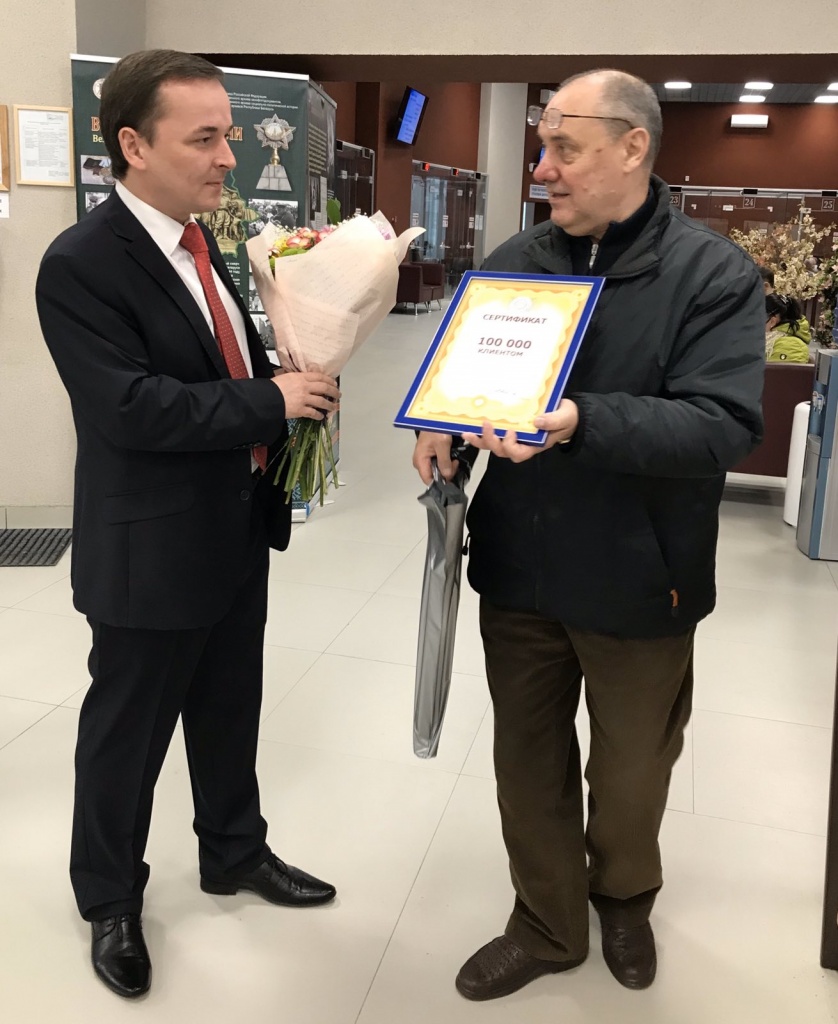 Юбилейного 100-тысячного клиента, которым стал Леонид Лукомский, обратившийся по вопросу государственной регистрации, поздравили цветами, памятным сувениром и вручили сертификат юбилейного клиента.
