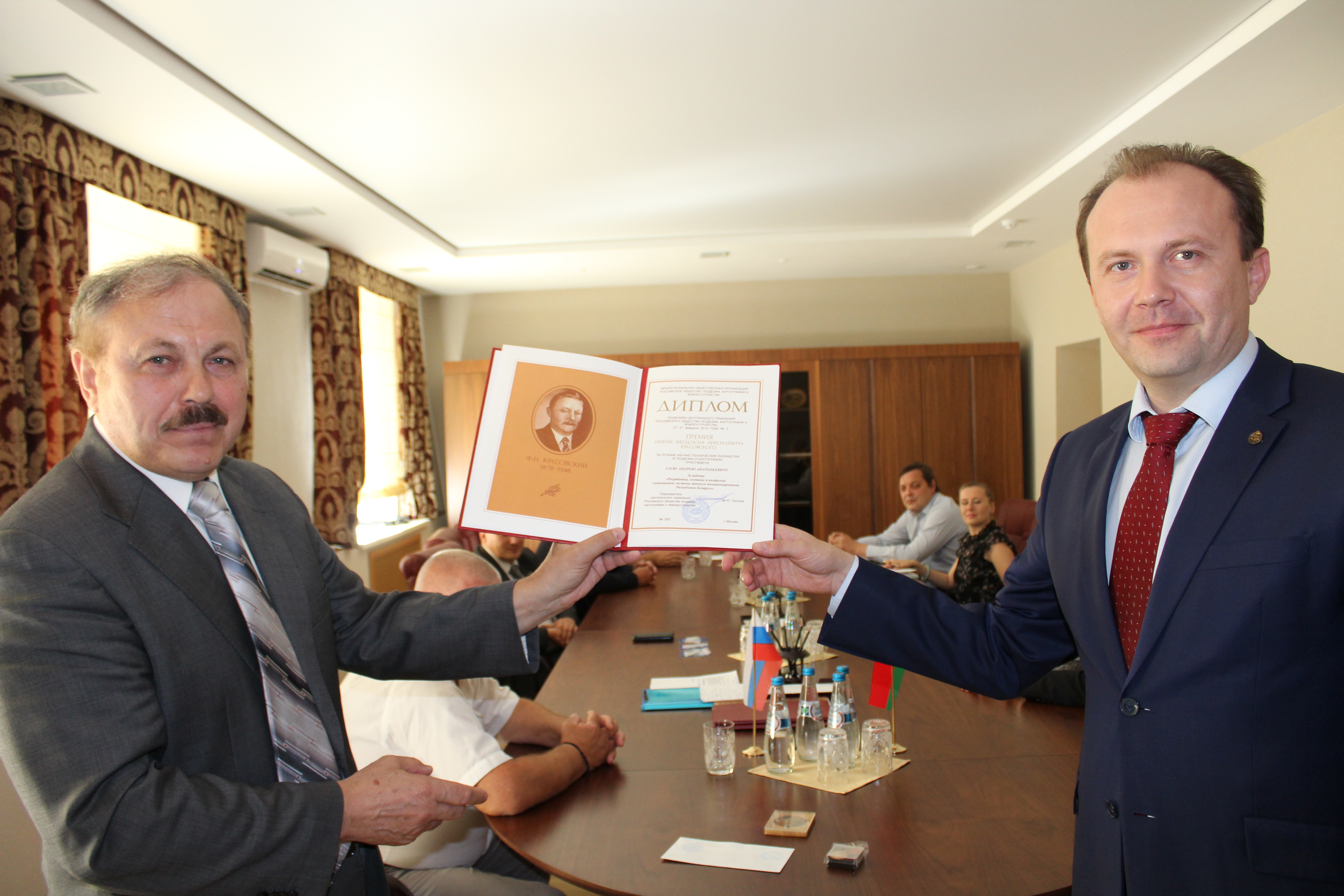 18 июня в Государственном комитете по имуществу члены правления межрегиональной общественной организации ”Российское общество геодезии, картографии и землеустройства“ Леонард Иосифович ЯБЛОНСКИЙ и Ринат Закиуллович АБДРАХМАНОВ вручили специалистам системы Госкомимущества премию имени Ф.Н.Красовского за работу ”Разработка, создание и внедрение спутниковой системы точного позиционирования Республики Беларусь“.