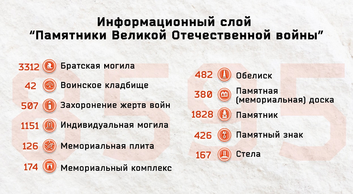 Благодаря информационному взаимодействию министерств, ведомств, государственных организаций и волонтеров данные доступны и понятны для каждого пользователя. Так, на сегодня информационный слой «Памятники Великой Отечественной войны» содержит данные о 3312 братских могилах, 42 воинских кладбищах, 507 захоронениях жертв войн, 1151 индивидуальной могиле, 126 мемориальных плитах, 174 мемориальных комплексах, 482 обелисках, 380 памятных досках, 1828 памятниках, 426 памятных знаках и 167 стелах.