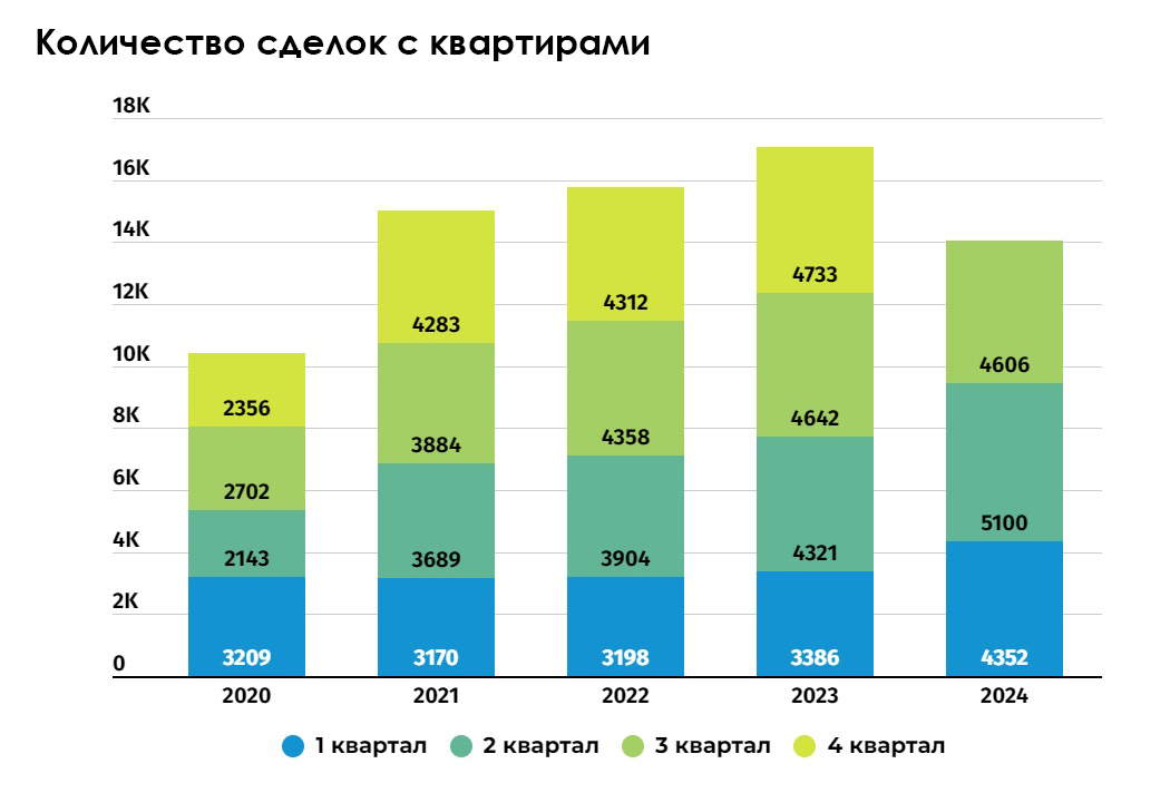 В 3-м квартале 2024 года покупатели потратили суммарно 356 млн долл. США в экв. на приобретение 235 тысяч жилых квадратных метров. Это на 7% меньше, чем в прошлом периоде, когда был установлен рекорд за историю наблюдений – 382 млн долл. США в экв. за 264 тысячи квадратных метров. С учетом уже достигнутых показателей за три квартала 2024 войдет в историю как один из наиболее активных периодов на рынке жилья.