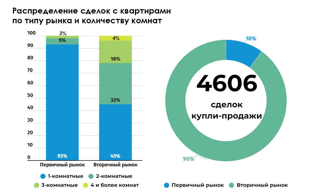 Доля сделок купли-продажи с квартирами на первичном рынке составила 10%, что соответствует среднеквартальному показателю, начиная с 2023 года. Учитывая небольшую долю первичного рынка в общей структуре сделок, средняя цена в каждом периоде может быть подвержена влиянию продаж квартир в конкретных домах или жилых комплексах, что приводит к искусственным «скачкам» цен, но не говорит о новых тенденциях на первичном рынке в целом.