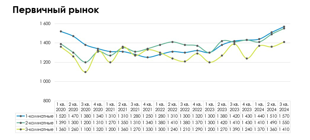 Поведение средних цен сделок в 3-м квартале по отношению к предыдущему аналогично вторичному рынку – квадратный метр однокомнатных и двухкомнатных квартир подорожал на 60 долл. США в экв. (+4%), трехкомнатных – на 50 долл. США в экв. (+4%).
