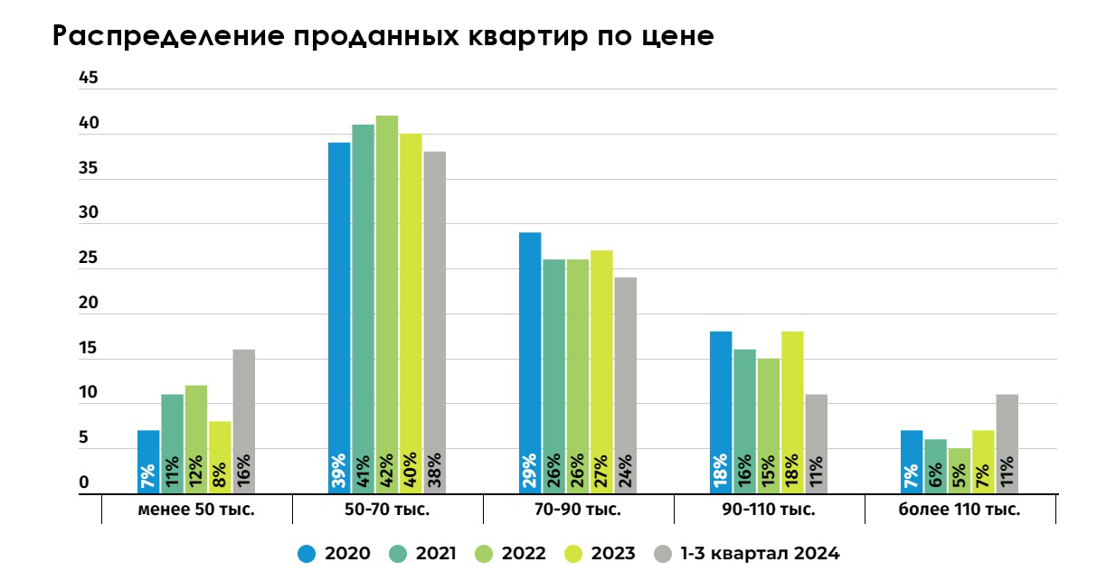 Чаще всего в Минске приобретали квартиры в диапазоне от 50 до 70 тыс. долл. США в экв. – на них приходится 38% от общего числа сделок. В 3-м квартале 2024 года в структуре проданных квартир по цене отмечены сдвиги как в более дешевом диапазоне – до 50 тыс. долл. США в экв., так и в более дорогом: на долю квартир стоимостью свыше 110 тыс. долл. США в экв. пришлось 11% сделок, тогда как в предыдущие три года – в среднем 6%.