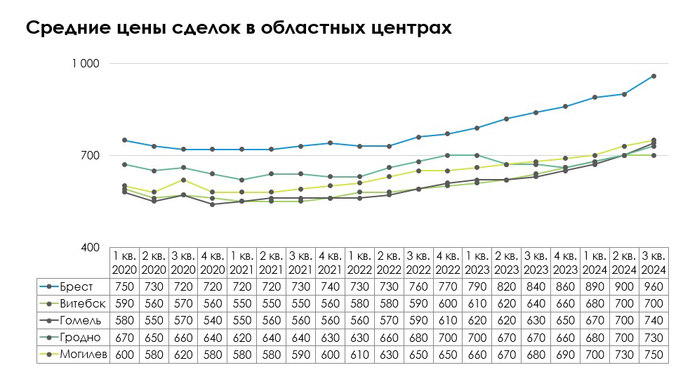 Средние цены сделок за 3-й квартал продолжали расти во всех областных центрах, кроме Витебска: