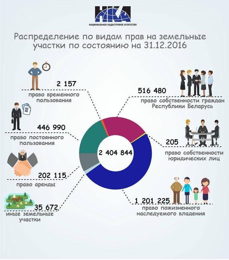 По сравнению с 2015 годом на 2 % стало больше земельных участков, принадлежащих на праве собственности гражданам и на 9 % – на праве собственности юридическим лицам, сообщили в Национальном кадастровом агентстве Государственного комитета по имуществу Республики Беларусь. В тоже время, в прошлом году произошло снижение количества земельных участков, принадлежащих землепользователям на правах постоянного пользования и праве пожизненного наследуемого владения – на 3,7 % и 4,8 % соответственно.