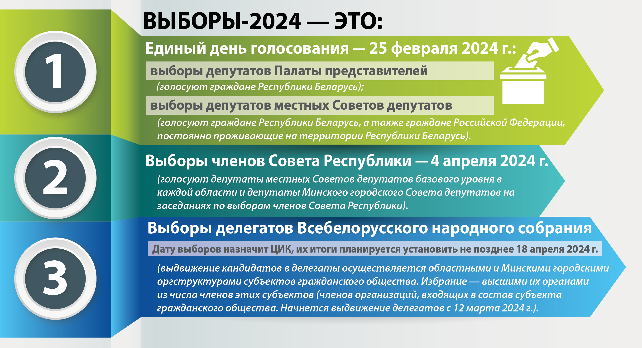 Единый день голосования в Беларуси пройдет 25 февраля 2024 года. Избираться будут депутаты Палаты представителей Национального собрания восьмого созыва и местных Советов депутатов двадцать девятого созыва. Кроме того, 4 апреля 2024 года пройдут выборы членов Совета Республики, затем – делегатов Всебелорусского народного собрания от субъектов гражданского общества и местных Советов депутатов.