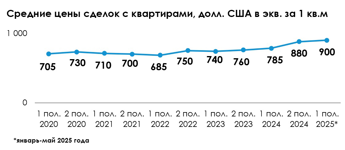 Такая доля сделок в новостройках оказывает влияние и на уровень средней цены. Так, с 2020 по май 2025 года рост средней цены составил 28%, и к концу периода анализа среднее значение установилось на отметке 900 долл. США в экв. за квадратный метр.