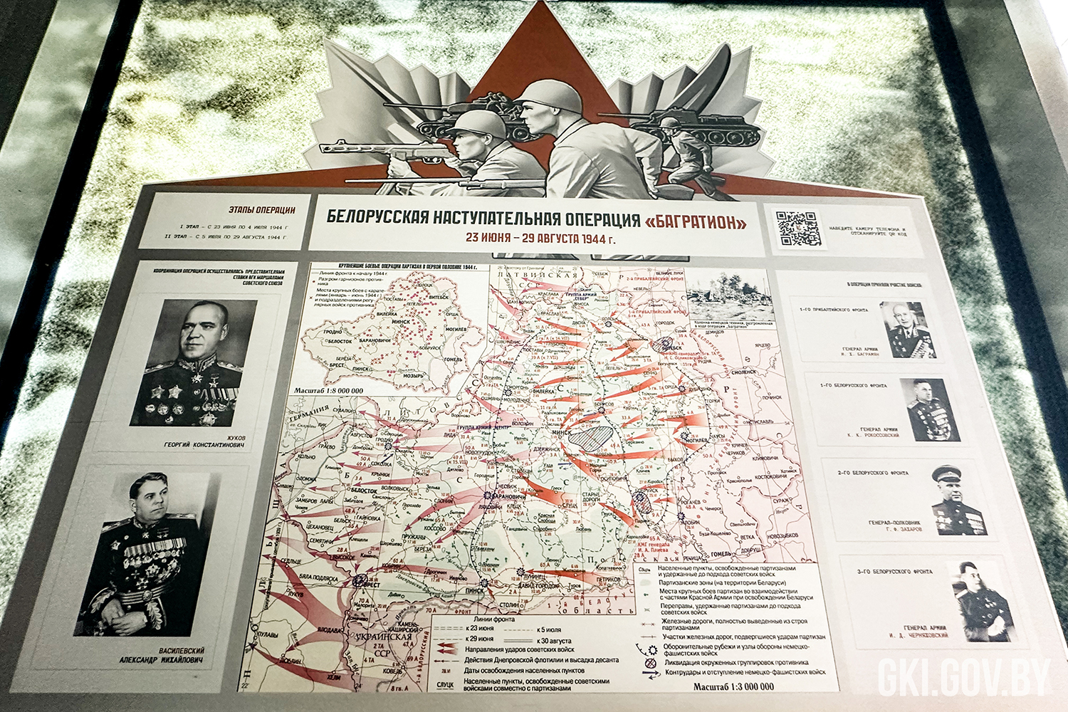 Также на выставке представлены десятки фотографий генералов, офицеров, рядовых военнослужащих, партизан, разрабатывавших планы стратегических и локальных боевых операций. Многие фотографии отражают суровые будни топографов при проведении операции «Багратион», буквально выдавившей захватчиков с территории нашей страны.