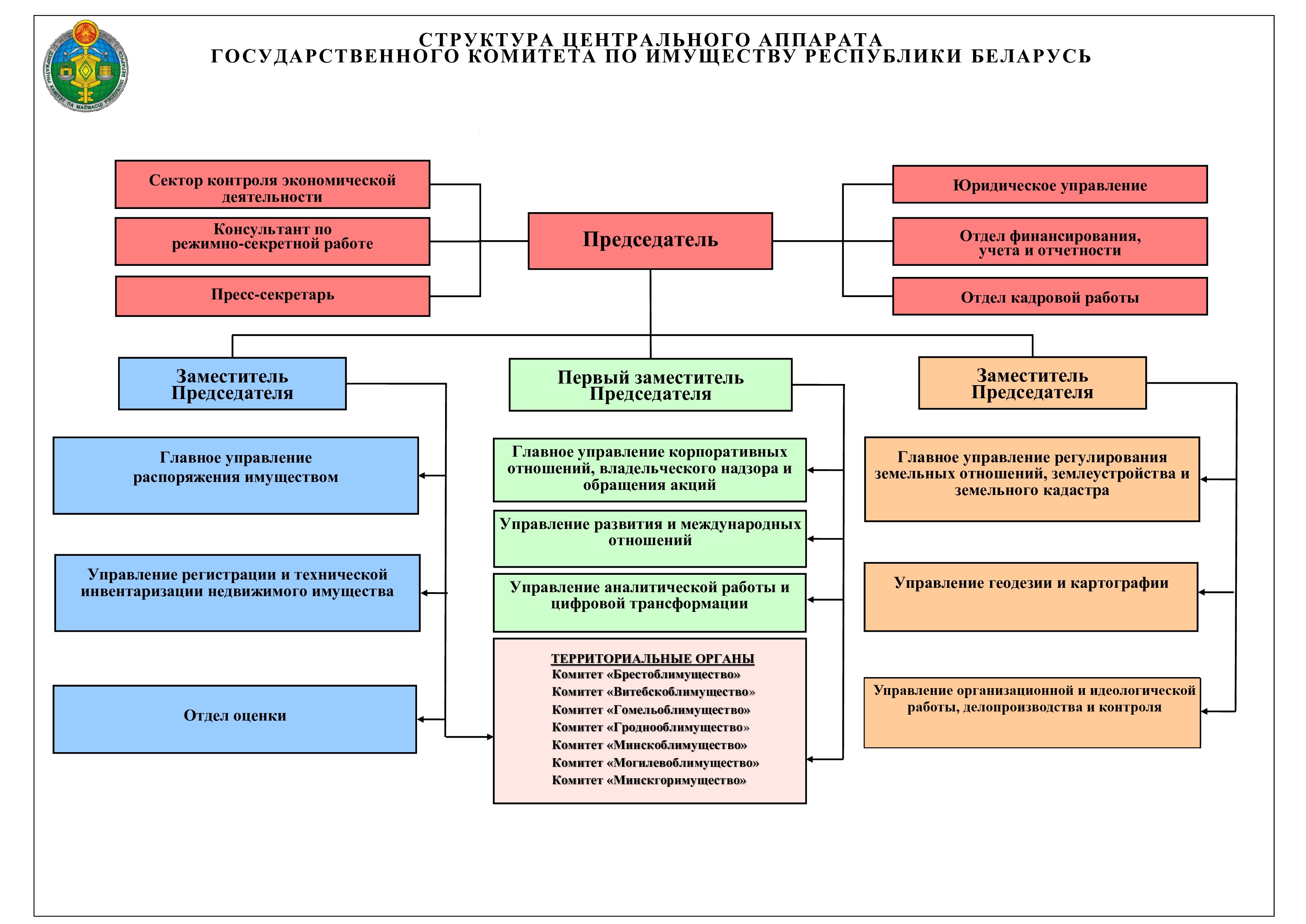 В структуру Госкомимущества входят главные управления, управления, отделы, секторы, а также структурные подразделения, осуществляющие обеспечение деятельности и техническое обслуживание в соответствии с законодательством.