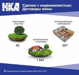 Согласно данным единого государственного регистра недвижимого имущества, прав на него и сделок с ним, в 2017 году в стране совершено 1 659 регистрационных действий по переходу права собственности на основании договора мены, сообщили в Национальном кадастровом агентстве.