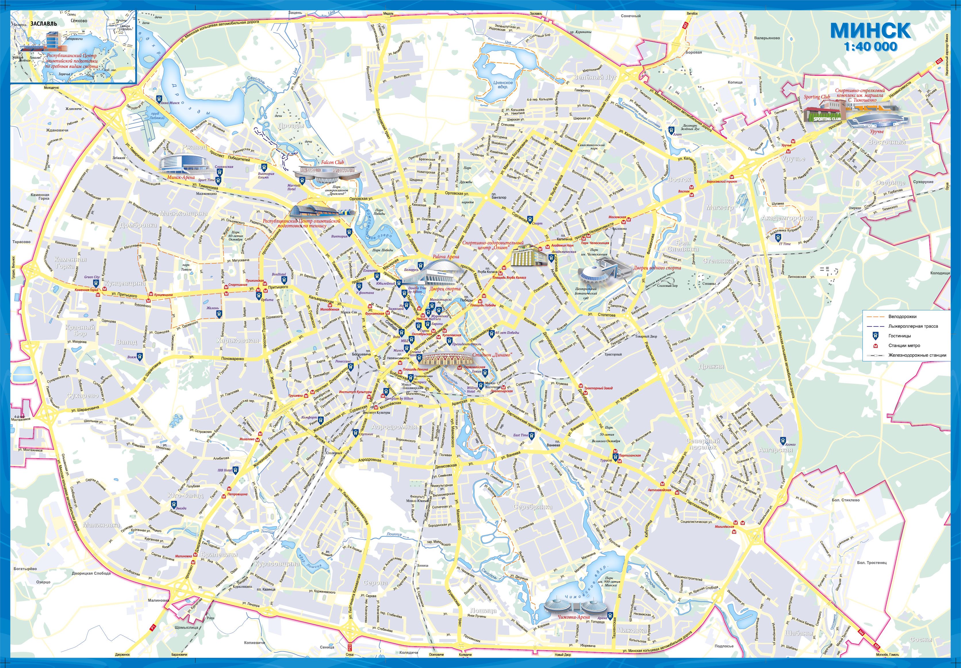 На карце «Мінск спартыўны» асноўны матэрыял плана горада адлюстраваны ў маштабе 1:40 000.